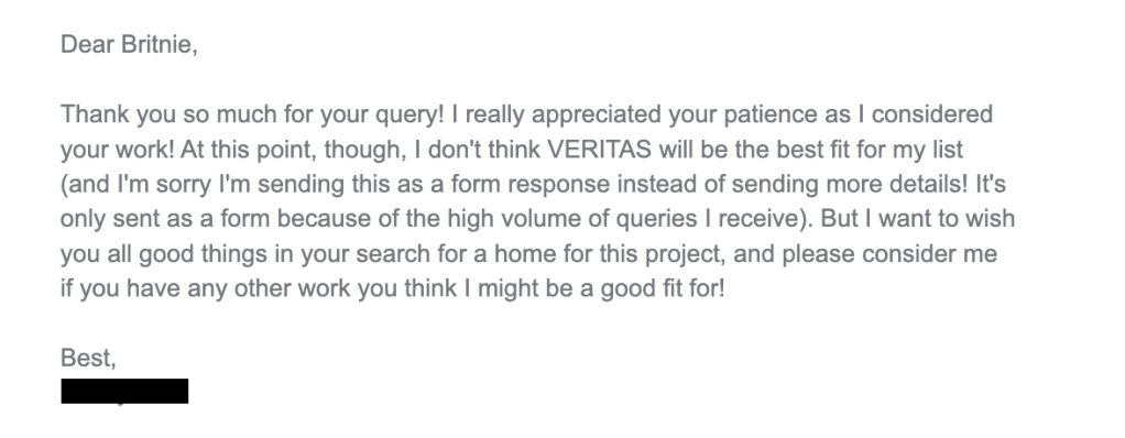 Below are examples of what these types of rejections look like. Some of them call out the fact that it’s a form letter, and others, you can tell that all they did was swap out the author’s name and the manuscript title.