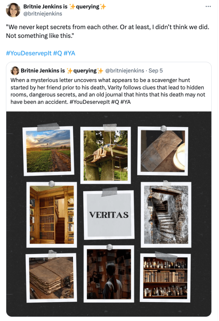 Pitch events occasionally happen on Twitter, where writers tweet out pitches. (Is it still called “tweeting”?) The format is always a little bit different from pitch to pitch, but this year, I saw that a lot of writers created mood boards or bulleted lists of things found in their story. Each pitch event has slightly different rules, but usually you are encouraged to tweet up to three versions of your pitch periodically throughout the day.